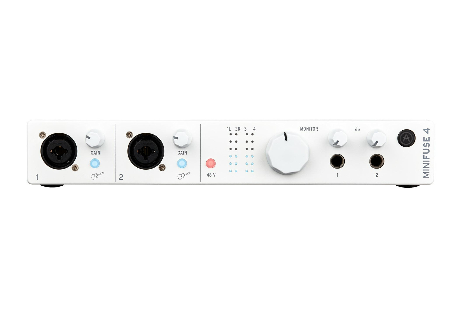 • Biała wersja MiniFuse 4 – 4 wejścia, 4 wyjścia, MIDI I/O, USB hub, 24-bit/192kHz, zasilanie USB.