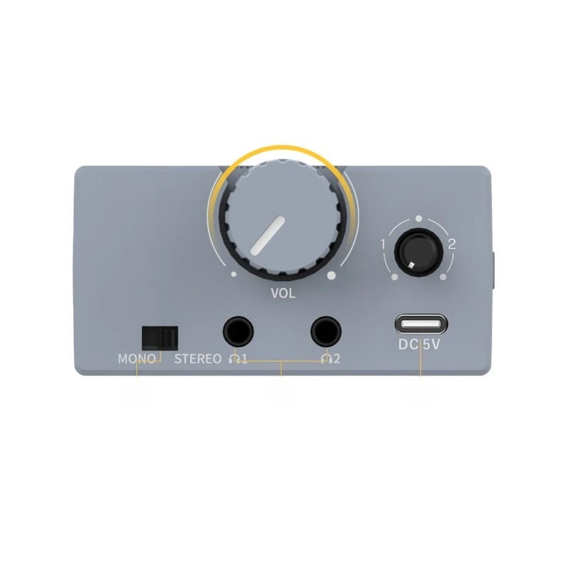 Wzmacniacz odsłuchowy, zakres częstotliwości: 20 Hz – 20 kHz, 2 x wejścia XLR, 1/4in. TRS, 2x wyjście słuchawkowe 3,5 mm TRS, moc wyjściowa: 250 Ω, czas pracy: do 12h