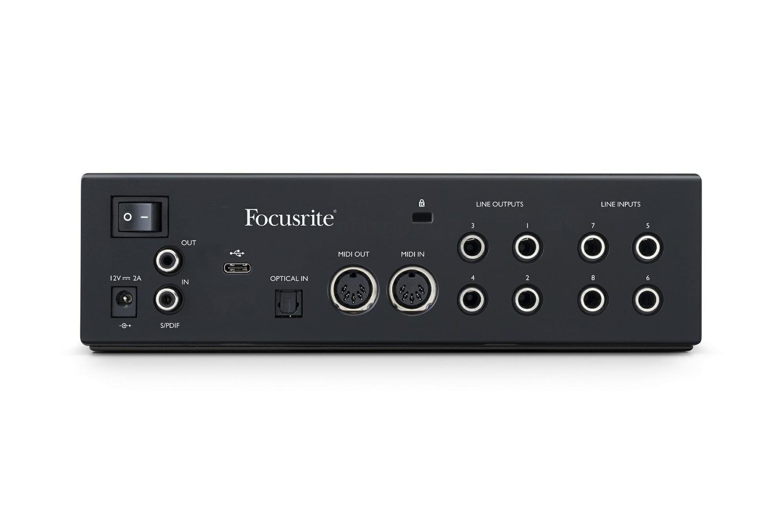 • 4 preampy z Air mode, 4 wejścia combo, ADAT, MIDI, 2 wyjścia słuchawkowe, 24-bit/192kHz, metalowa obudowa.