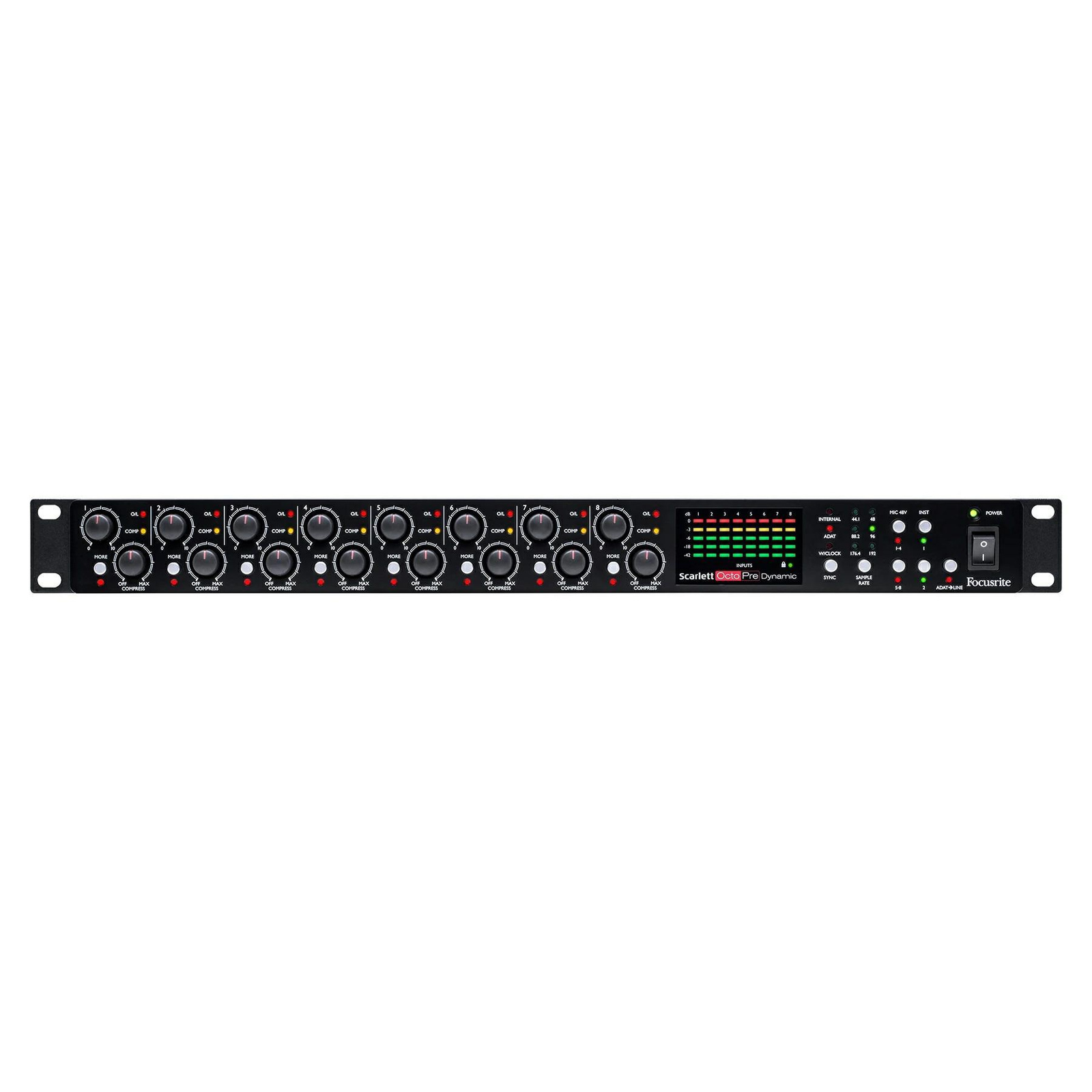 Przedwzmacniacz mikrofonowy Scarlett OctoPre Dynamic to wersja ośmiokanałowego preampu rozszerzona o analogowy kompresor na każdym kanale. Za pomocą pokrętła Compress ustalamy głębokość kompresji a przycisk More pozwala przełączać pomiędzy 2 ustawieniami ratio. Dzięki dwóm gniazdom ADAT Out możesz przesłać sygnał w częstotliwości próbkowania nawet do 192 kHz w 24-bitowej dynamice. Ponadto Scarlett Octopre Dynamic jest wyposażone w osiem symetrycznych wyjść liniowych.