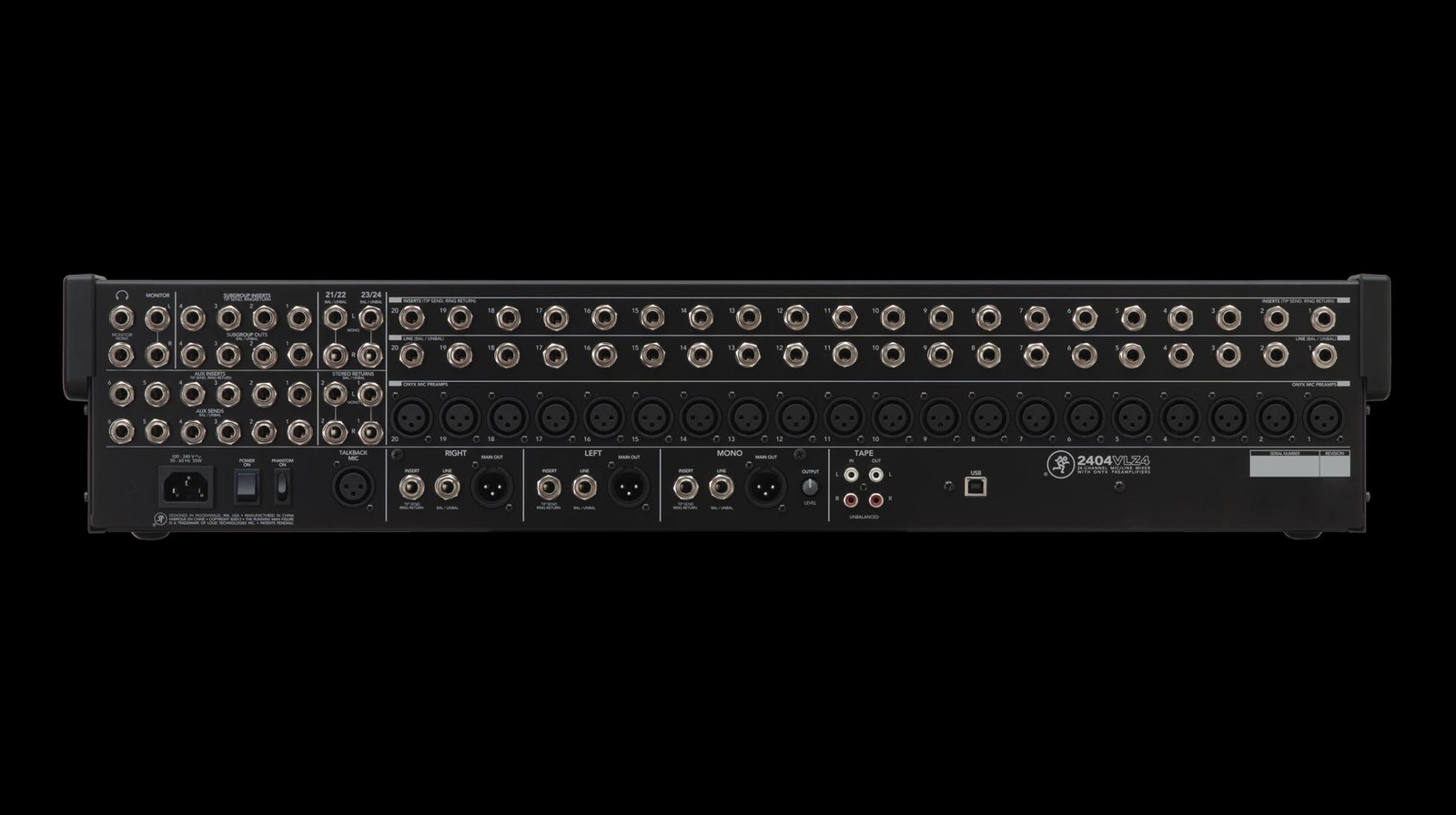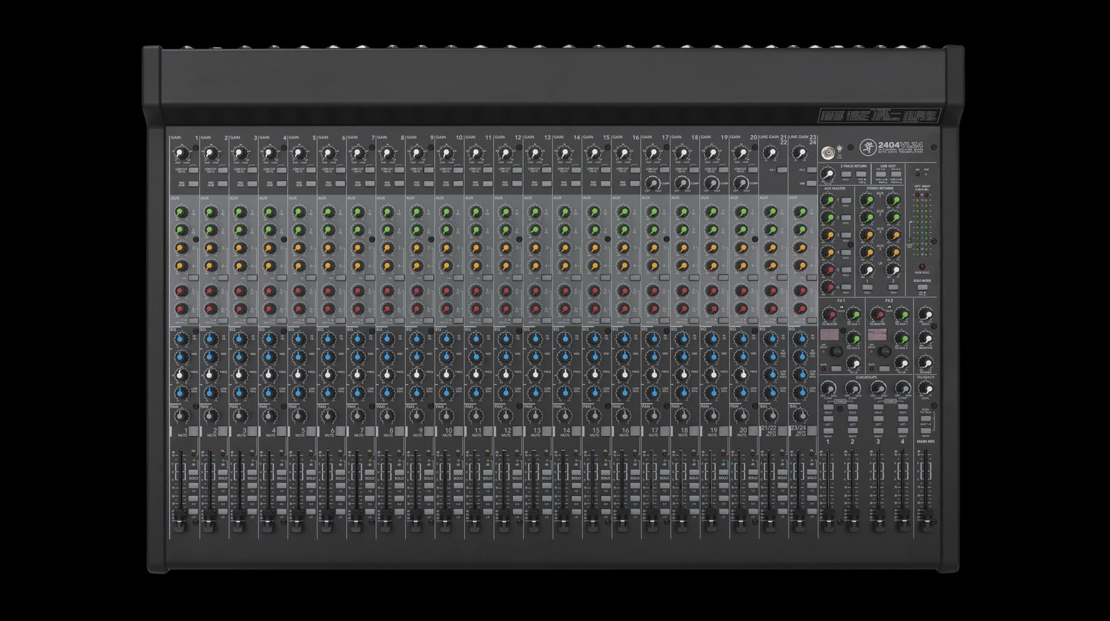 - 24-kanałowy mikser analogowy. 20 przedwzmacniaczy mikrofonowych Onyx, Zasilanie fantomowe, Wybieralne wejścia instrumentalne, 3-pasmowy korektor (80 Hz, 2,5 kHz, 12 kHz), Filtr górnoprzepustowy 18 dB/okt. 100 H