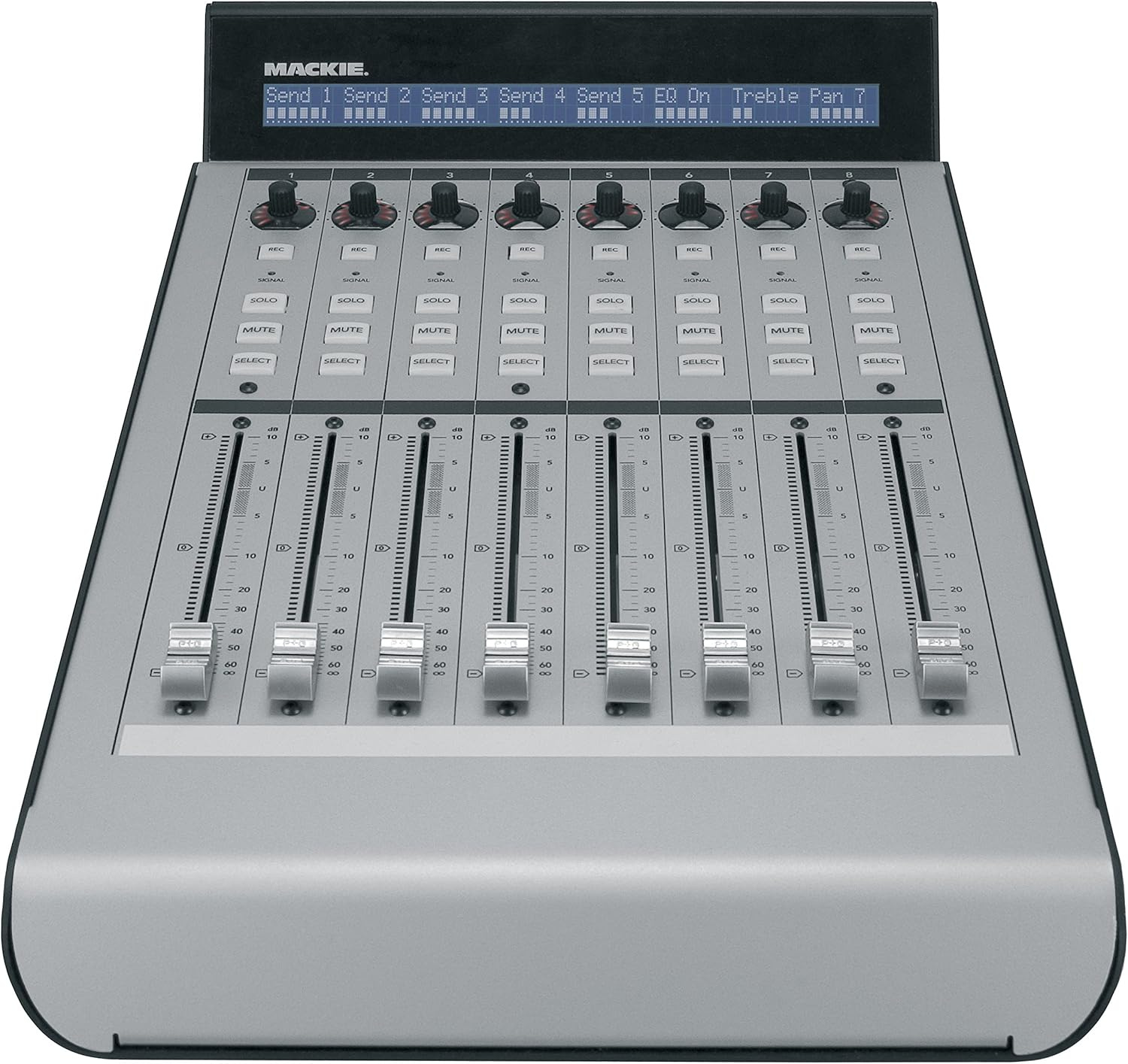 - 8-kanałowe rozszerzenie dla kontrolera Mackie Control Universal Pro. 100-milimetrowe, dotykowe, optyczne, zmotoryzowane suwaki Alps. Wielofunkcyjne potencjometry V-Pot do szybkiej kontroli panoramy, poziomów efektów.