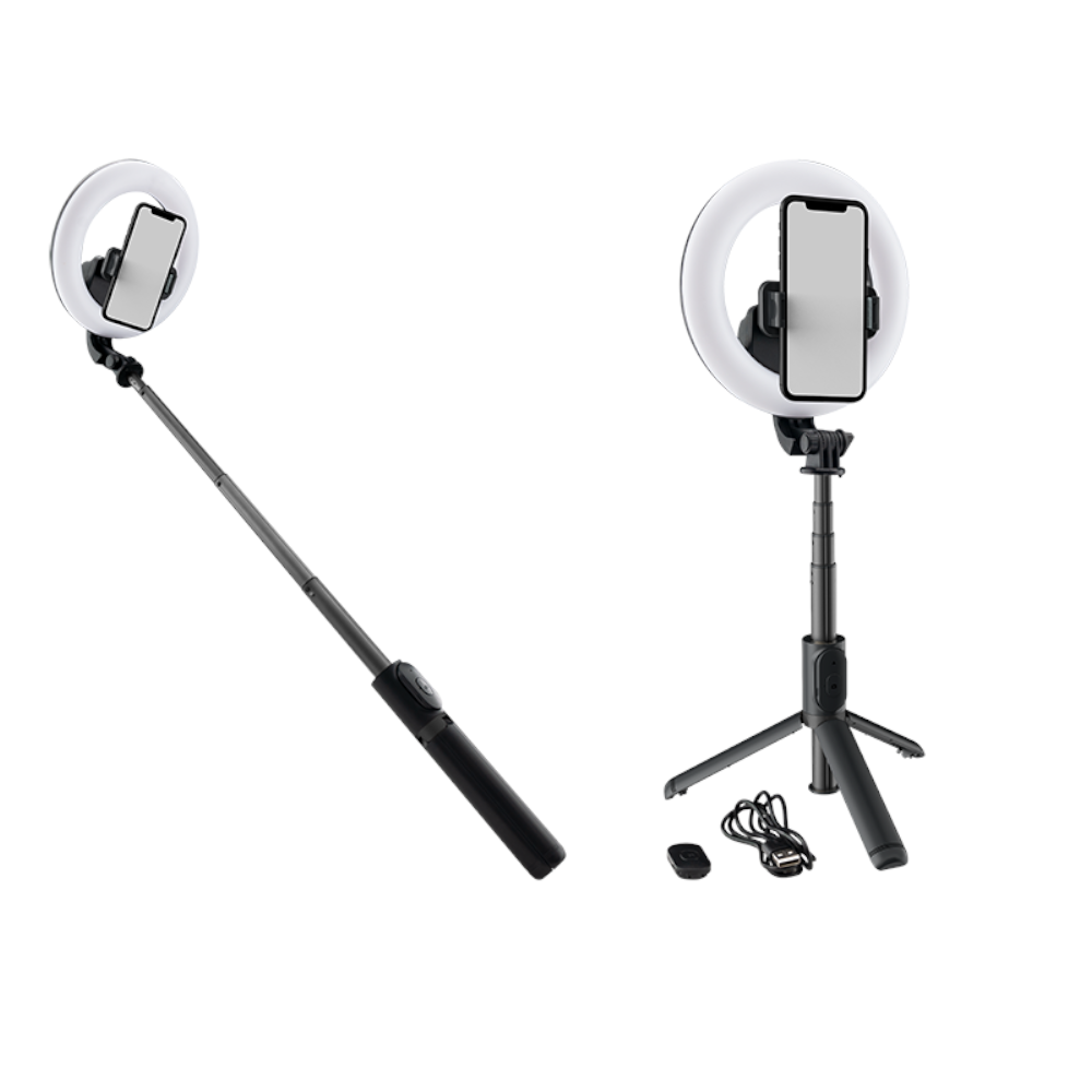 - Pierścień LED 15,2 cm, zasilanie akumulatorowe, ściemniacz, USB-C, uchwyt na smartfon, teleskopowy statyw/selfie stick, pilot Bluetooth, waga 0,3 kg.
