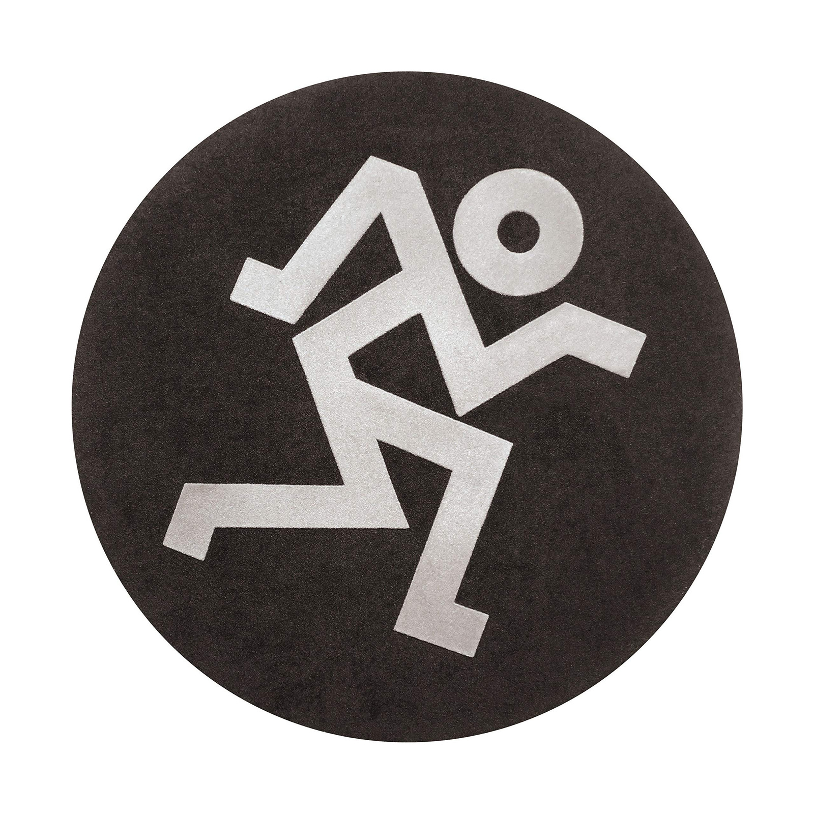 Okrągły, czarny dywan o średnicy 34 cali (76.2 cm) z białym logo Mackie.