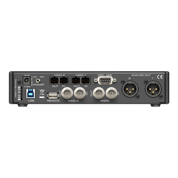 • Interfejs audio USB 3.0, 394 kanały, 24-bity/192kHz, 3x MADI I/O [2x Optical, 1x Coax], 2x Mic/Line, 2x XLR Out, wyjście słuchawkowe, AES/EBU, MIDI, Word Clock, TotalMix FX, Room EQ, DigiCheck, SteadyClock FS, ARC USB [opcja]