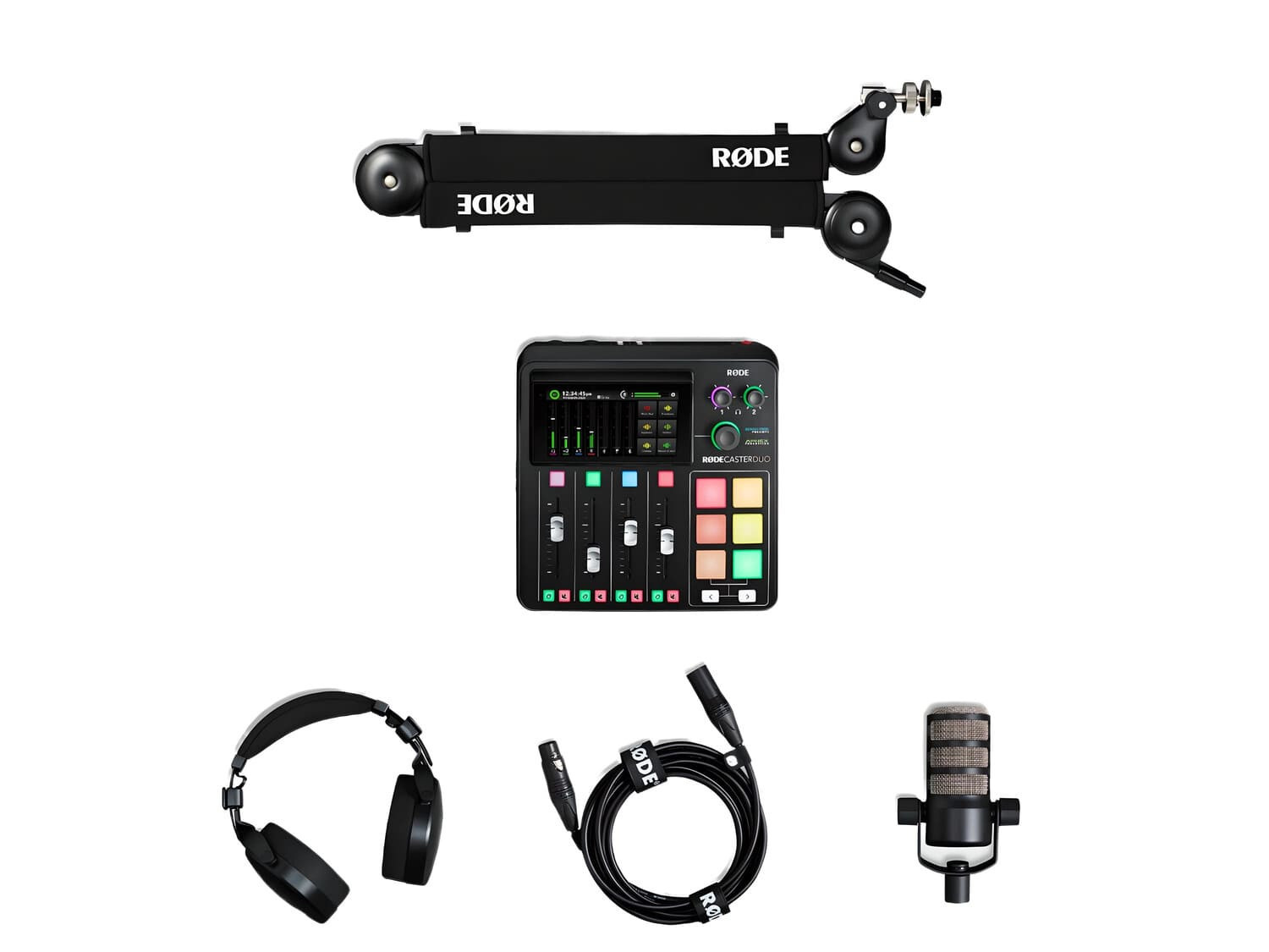 Zestaw do produkcji podcastów dla 1 osoby, składa się z konsoli RØDECaster Duo, mikrofonu PodMic, słuchawek NTH-100, statywu PSA1+ oraz kabla mikrofonowego 3m XLR-3