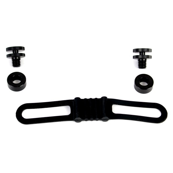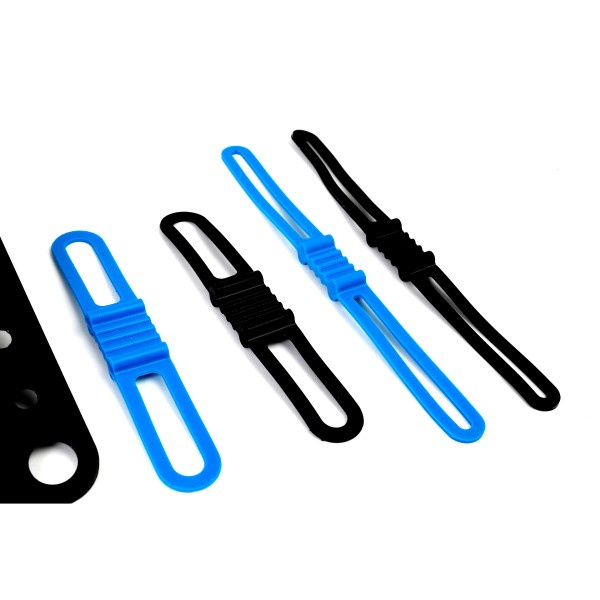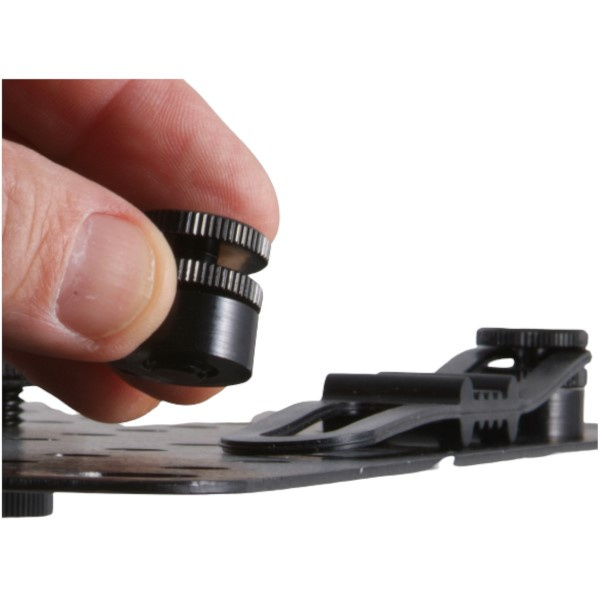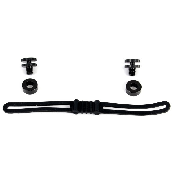 IO Desk zawiera cztery gwintowane 3/8-calowe kołki zabezpieczające i cztery silikonowe paski, które mogą być użyte, żeby przymocować sprzęty do podstawki IO-Desk. Rozstaw swoje urządzenie tak jak zamierzasz z niego korzystać i rozmieść kołki tak, żeby jak najlepiej je zabezpieczyć. Umieść silikonowe paski nad urządzeniem i załóż bezpośrednio na kołki, a następnie napnij je wedle własnych potrzeb.